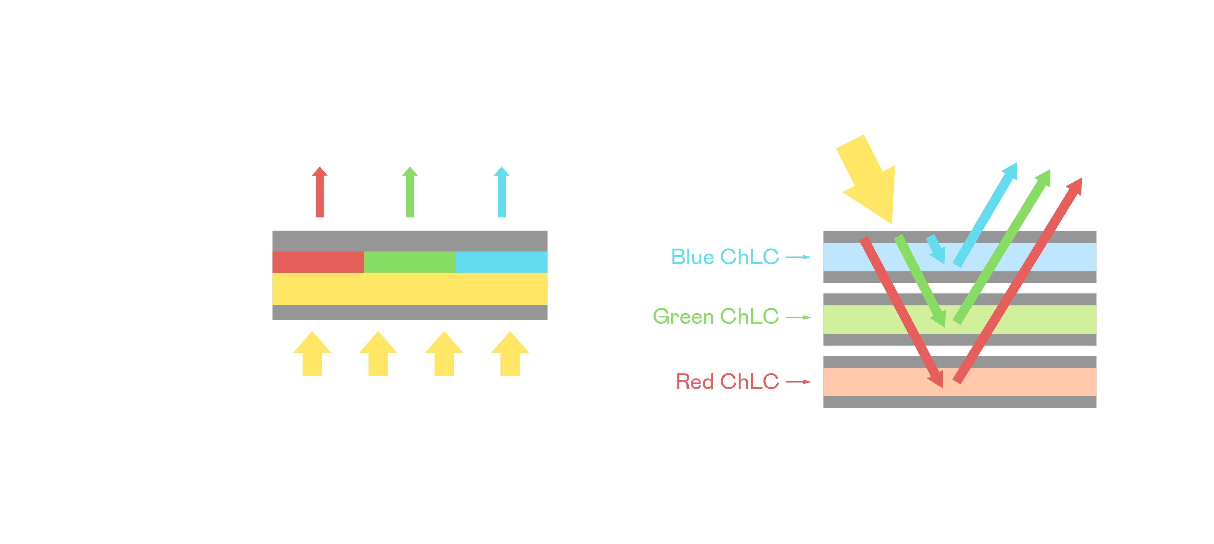 红桃视频传媒解说胆固醇液晶显示器是由红、绿、蓝三层胆固醇液晶面板堆叠而成,并采用无彩色滤光片设计,减少环境光在反射过程中的损耗。